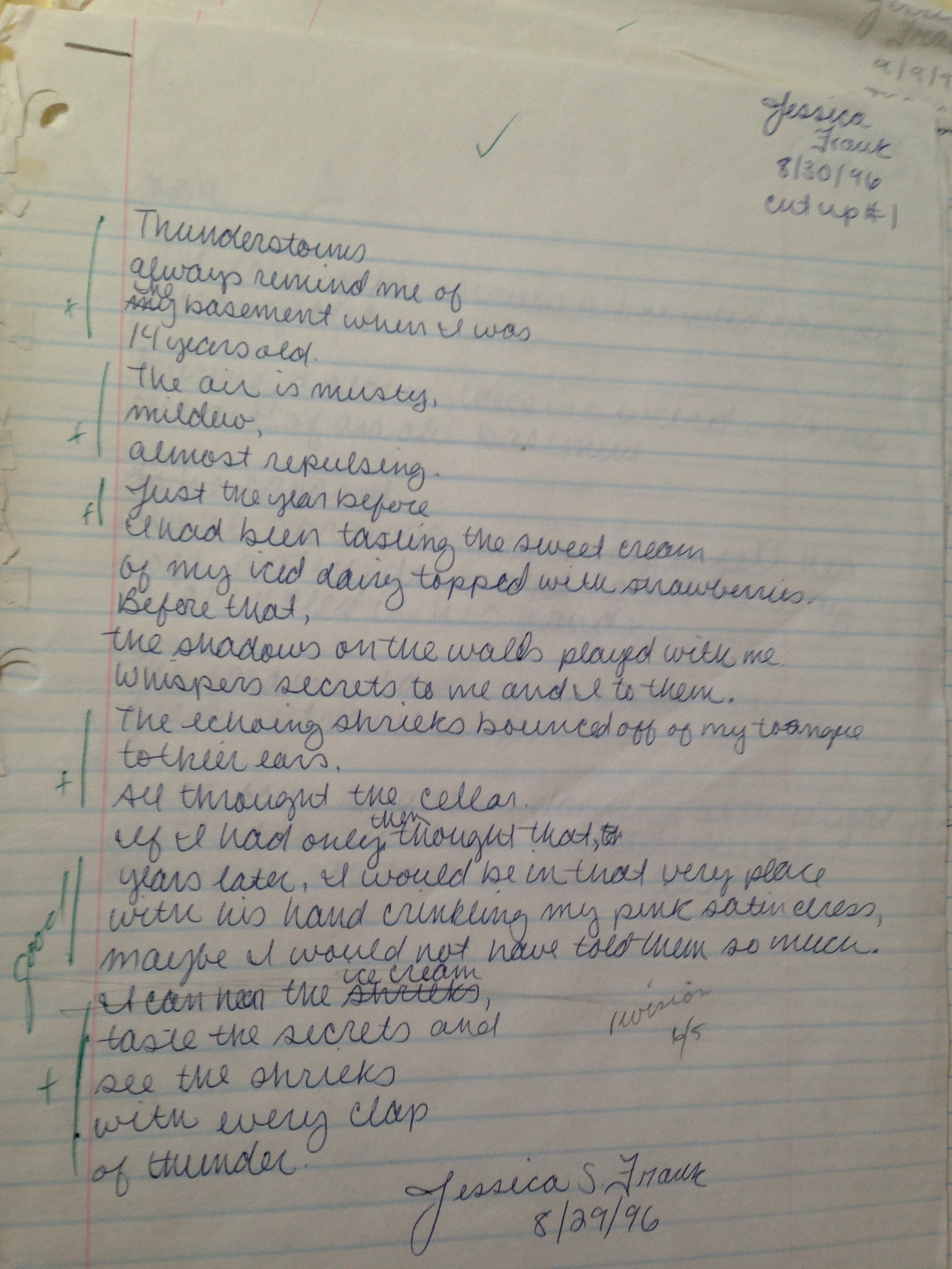 Teenage Jessica could foretell the future, but only the teenage-angst filled future. I don’t regret getting married nor having kids. But I do regret putting this portion of my life on the back-burner for so long. It wasn’t until 2010 that I brought my writing back to life. I had to. I was drowning, choking on domesticity, wildly unhappy, and afraid I was heading for exactly what that first poem read-aloud was talking about.